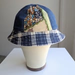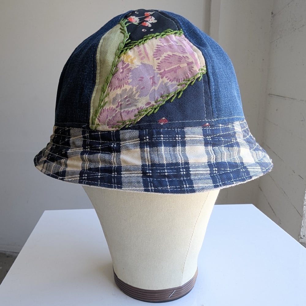 Each of these reversible bucket hats is handmade in Los Angeles, constructed from individually sourced vintage garments. Every piece is one of a kind. Fabrics vary from cotton, denim, fleece, to wool depending on the specific hat.
