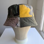 Each of these reversible bucket hats is handmade in Los Angeles, constructed from individually sourced vintage garments. Every piece is one of a kind. Fabrics vary from cotton, denim, fleece, to wool depending on the specific hat.
