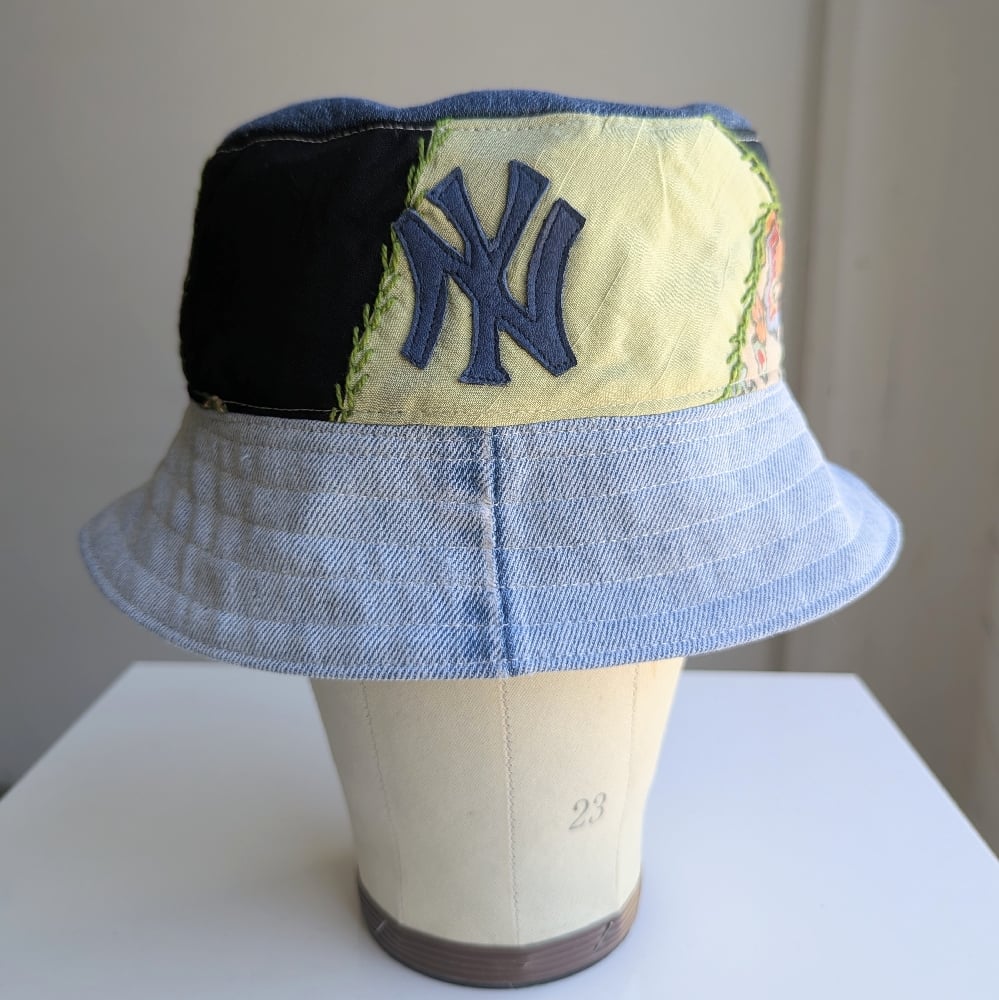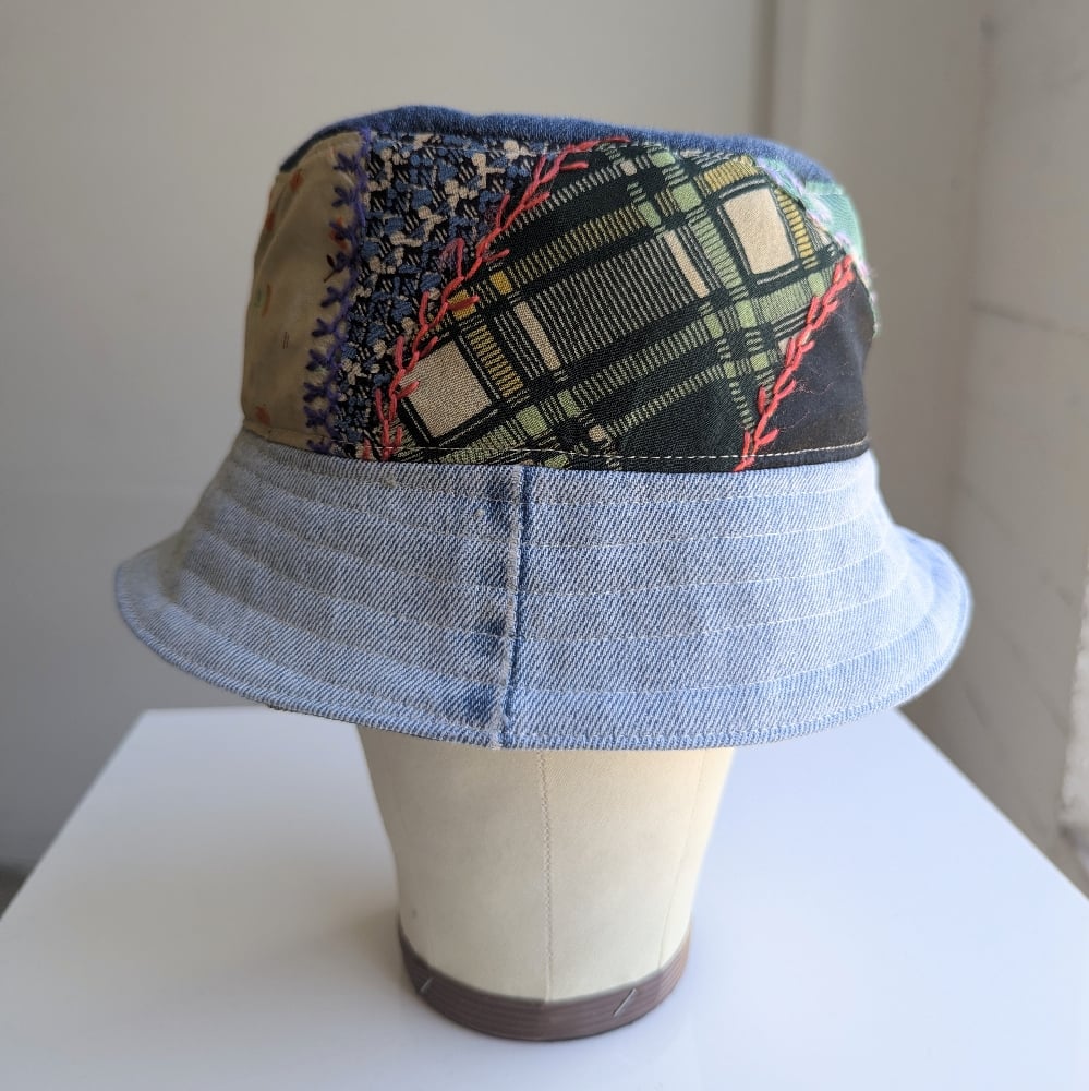 Each of these reversible bucket hats is handmade in Los Angeles, constructed from individually sourced vintage garments. Every piece is one of a kind. Fabrics vary from cotton, denim, fleece, to wool depending on the specific hat.