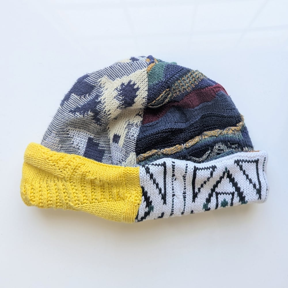 Each of these reversible beanies is handmade in Los Angeles using four different vintage sweaters, making every piece truly one of a kind.