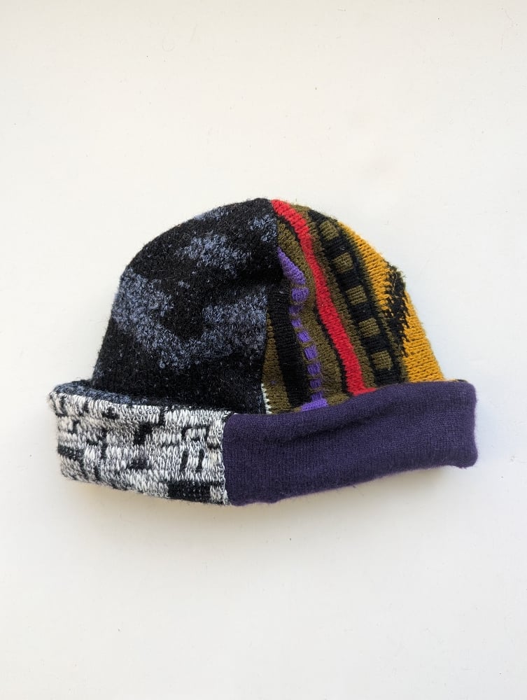 Each of these reversible beanies is handmade in Los Angeles, using four different vintage sweaters, making every piece truly one of a kind. The fabrics used vary from acrylic, wool, to cashmere, depending on the specific beanie.
