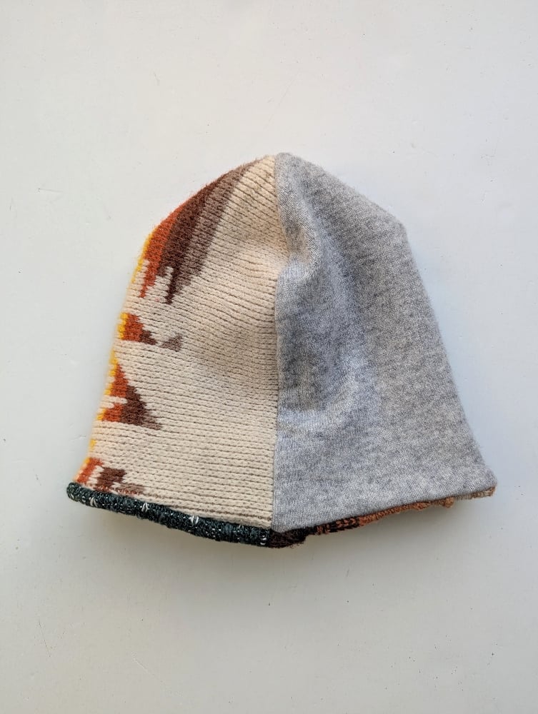 Each of these reversible beanies is handmade in Los Angeles, using four different vintage sweaters, making every piece truly one of a kind. The fabrics used vary from acrylic, wool, to cashmere, depending on the specific beanie.